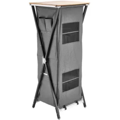Armoire polyvalente robuste avec cadre transversal en profilé d’aluminium rectangulaire et joint central en métal. Tous les pieds sont réglables en hauteur. Avec 4 étagères intérieures et un plan de travail en bambou. Système sans support.