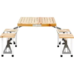 Avec cette table de pique-nique pliable dans tes bagages, tu peux aussi t’asseoir de manière conviviale en route, planifier des étapes, manger ensemble et jouer à des jeux. Fabriquée à partir d’une solide structure en aluminium et d’un bois de sapin chic, cette table de pique-nique attire tous les regards. Au centre du plateau de table se trouve un logement pour un parasol (non fourni). Les quatre sièges et le plateau de table sont reliés entre eux, ce qui te permet de tout avoir sous la main et de ne plus jamais devoir chercher une seule chaise dans le coffre. En quelques gestes seulement, l’ensemble de table est monté et reste stable. Après utilisation, tout se replie à plat et tu peux porter le paquet grâce à la poignée pratique.