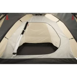 Cette tente vous promet des séjours au camping réussis ! Les arceaux et le tissu présentent un marquage couleur qui permet de monter la tente très facilement. Grâce à des empiècements en maille-filet, vous profitez d’une bonne aération. Le capot de protection imperméable vous protège des éventuelles averses. Vous pouvez utiliser l’entrée comme espace de rangement. Elle possède également deux fenêtres qui laissent passer la lumière.