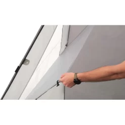 La Shamrock offre une construction en tunnel polyvalente et est équipée d’un mât en fibre de verre pré-courbé, ainsi que de mâts en fibre de verre externes pour plus de stabilité et d’un dispositif de tension pour la toile de tente. De nombreuses caractéristiques rendent le vestibule fermé idéal pour les voyages aller-retour : Hauteur debout, quatre fenêtres avec rideaux, une grande porte avant qui peut également être utilisée comme abri supplémentaire, une grande porte arrière, de grandes aérations sur les côtés, des aérations à l’avant et un plancher de tente enroulable qui couvre toute la surface intérieure.