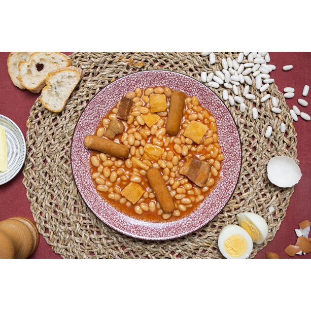 Water, white beans 37%, sausages 11% (pork and beef meat 81%, pork fat, water, salt, spices, spice extracts, seasoning, dextrose, flavouring, colour: E-120i, stabiliser: E-450, antioxidant: E-300, acid: E-330, E-331, emulsifier: E-472, preservative: E-250), bacon 8% (pork belly, water, salt, sugar, stabiliser: E-451i, antioxidant: E-316, preservative: E-250), omelette 6% (egg, water, rice flour, salt, acid: E-300), mushrooms 6%, tomato paste, sugar, wheat flour, salt, apple vinegar (contains sulphites), pepper and thickener: E-415. Allergen declaration EU: Contains egg, gluten and sulpher dioxide & sulphite.