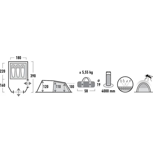 Tente tunnel sportive avec porche. Le grand porche dispose d’une entrée latérale pour plus de liberté de mouvement et permet de ranger parfaitement les bagages ou peut servir de salon sous la pluie. Le porche possède une toile cousue à la tente intérieure. L’avantage est que le sol est toujours dans la bonne position, ce qui permet d’éviter tous les glissements gênants. Les bandes de toile à pourrir empêchent la saleté et l’humidité de s’infiltrer. Des fenêtres en film transparent font entrer la lumière dans la tente et les rideaux protègent des regards indiscrets. 3 aérations permanentes assurent une aération optimale de la tente dans toutes les conditions climatiques et restent ouvertes constamment. La tente a des fermetures éclair extra résistantes et des boucles de tension réfléchissantes pour plus de sécurité. Les sardines en acier de 5 mm de diamètre, très solides, ne se plient pas même sur des surfaces dures. Pour le contreventement, des sardines spéciales de 5 mm en acier rectifiés avec crochets sont fournis pour une meilleure tenue des lignes de tension. La fermeture éclair est équipée d’une gouttière supplémentaire. Cela protège contre la pénétration de l’humidité. La toile extérieure est montée en première, puis les toiles intérieures sont accrochées. L’avantage est que les toiles intérieures restent sèches pendant le montage par temps de pluie. Toile intérieure avec Vario Vent Control System. L’entrée en gaze éloigne les nuisibles et peut être facilement réglée de l’intérieur, en fonction du climat. Le rabat du couvercle se range facilement dans un sac. La corvée de l’enroulement est reléguée aux oubliettes. 2 ouvertures permanentes assurent l’aération lorsque le système Vario Vent Control est fermé. Des poches pratiques pour les ustensiles et le porte-lampe rendent la chambre confortable. Les coutures sont scellées hermétiquement avec un ruban et garantissent une meilleure résistance à la déchirure. L’Atmos 3 peut accueillir 3 personnes et offre suffisamment d’espace pour les bagages. L’idéal pour des vacances en camping ou des week-ends dans la nature