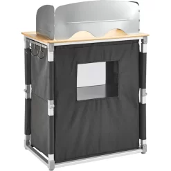 Fabriqué dans un élégant tissu noir et gris, avec dessus de table robuste en bambou, ce modèle est doté de trois crochets pratiques d´un côté et d´une poche de rangement de l´autre. Cette table de cuisine est équipée d´un support rabattable pour cuvette ou sac poubelle, ainsi que d´un paravent pour protéger les flammes des brûleurs.