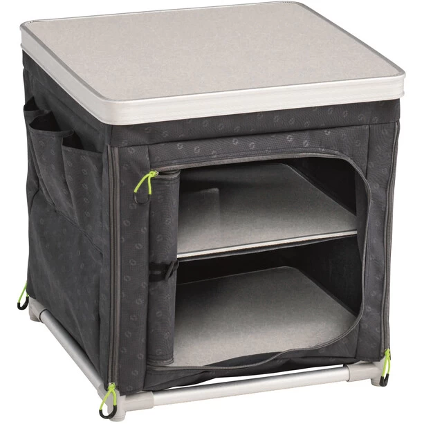 Armoire pliante Outwell avec deux étagères, une porte avec fermeture éclair et des ouvertures de ventilation en maille.