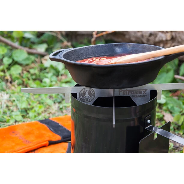 Avec le foyer Petromax, vous pouvez déjà utiliser la chaleur au-dessus du foyer. Les deux parties sont assemblées avec une poignée. Pendant que le charbon de bois ou les briquettes du barbecue sont portés à la lueur, suffisamment de chaleur de cuisson est déjà produite pour faire rôtir les premiers ingrédients dans une casserole ou une poêle ou, par exemple, pour préparer de délicieuses boissons. Aucune perte de chaleur n’est inutilisée. Bien entendu, la cheminée peut également être utilisée comme sous-verre pratique. Le support croisé s’adapte sur les grilles d’entrée ou les cheminées d’un diamètre de 14,5 cm à 16,5 cm et de 19 cm à 25 cm.
