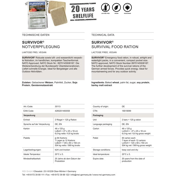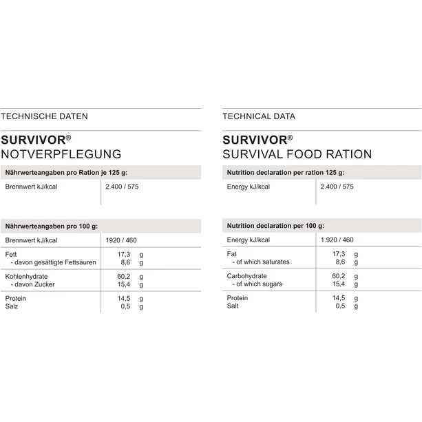 Ration d’urgence robuste et étanche à l’air et à l’eau, dans un format de poche pratique et compact. Approuvé par l’OTAN, numéro de nomenclature OTAN 8970145508187 comprimés. La poursuite du développement des rations de survie de la Bundeswehr. Fournit une puissance rapide. Idéal pour les alpinistes et toutes les activités de plein air.